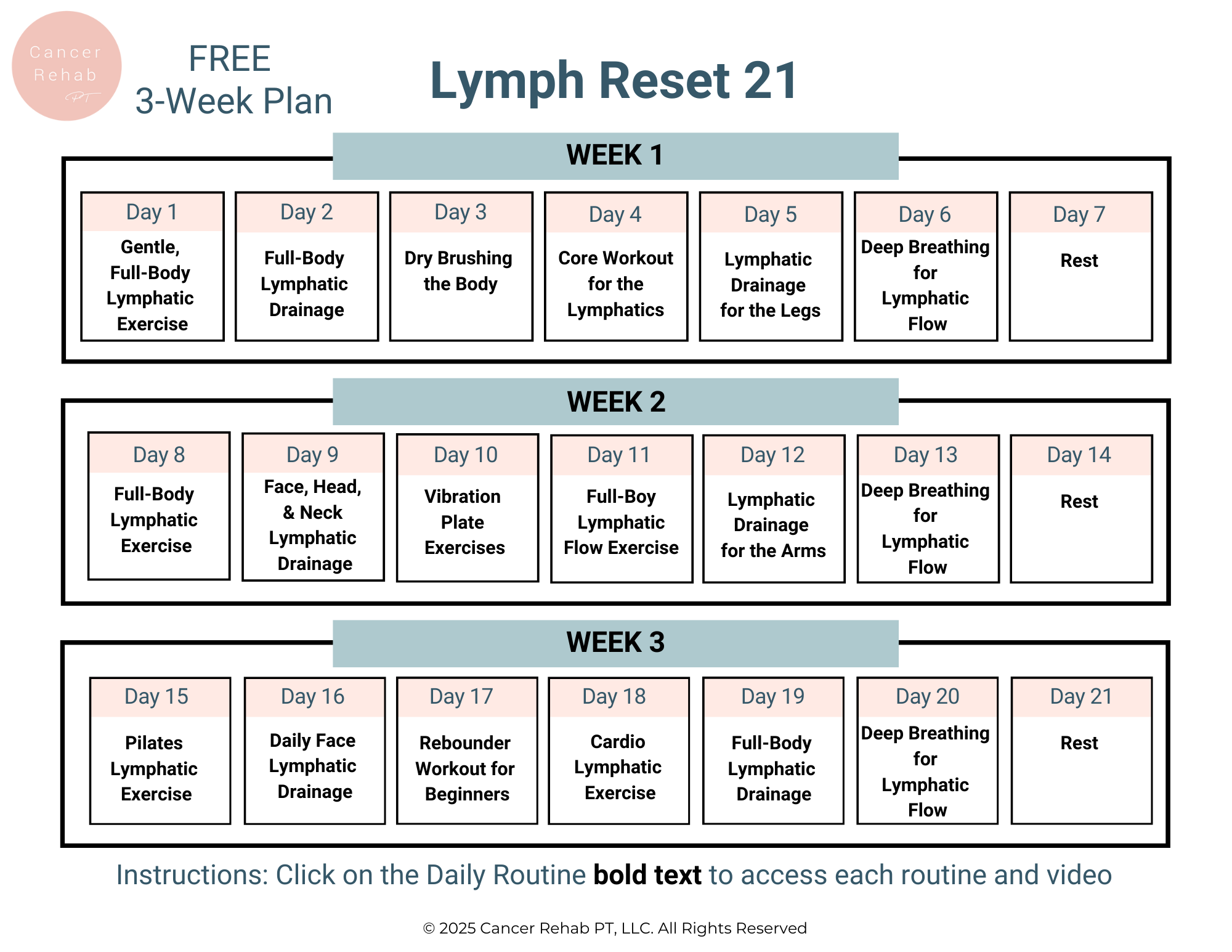 Lymph Reset 21 — a free 3-week program with daily lymphatic drainage and exercise routines designed by a physical therapist & certified lymphedema specialist. Gentle, effective, and doable for every body.